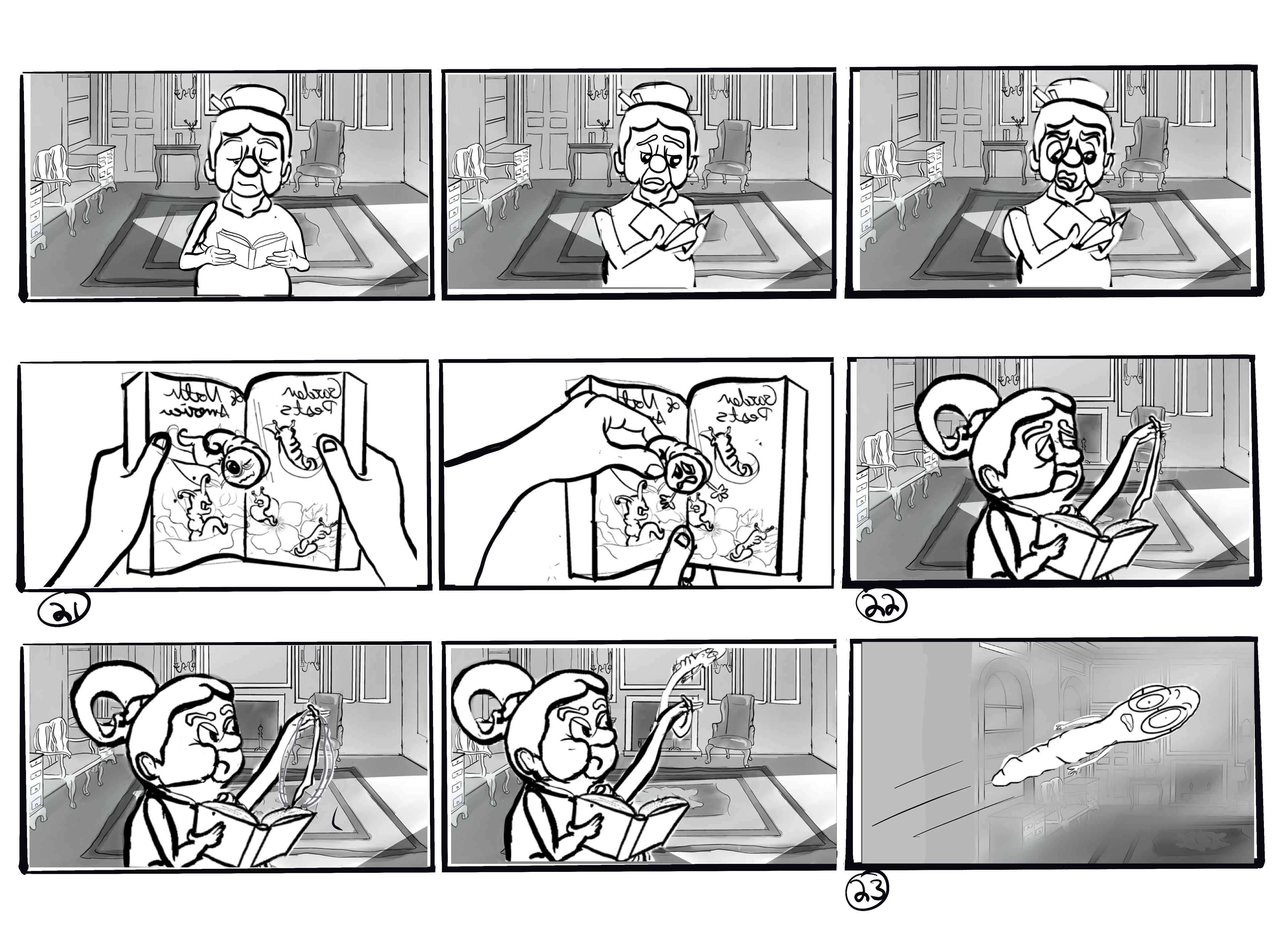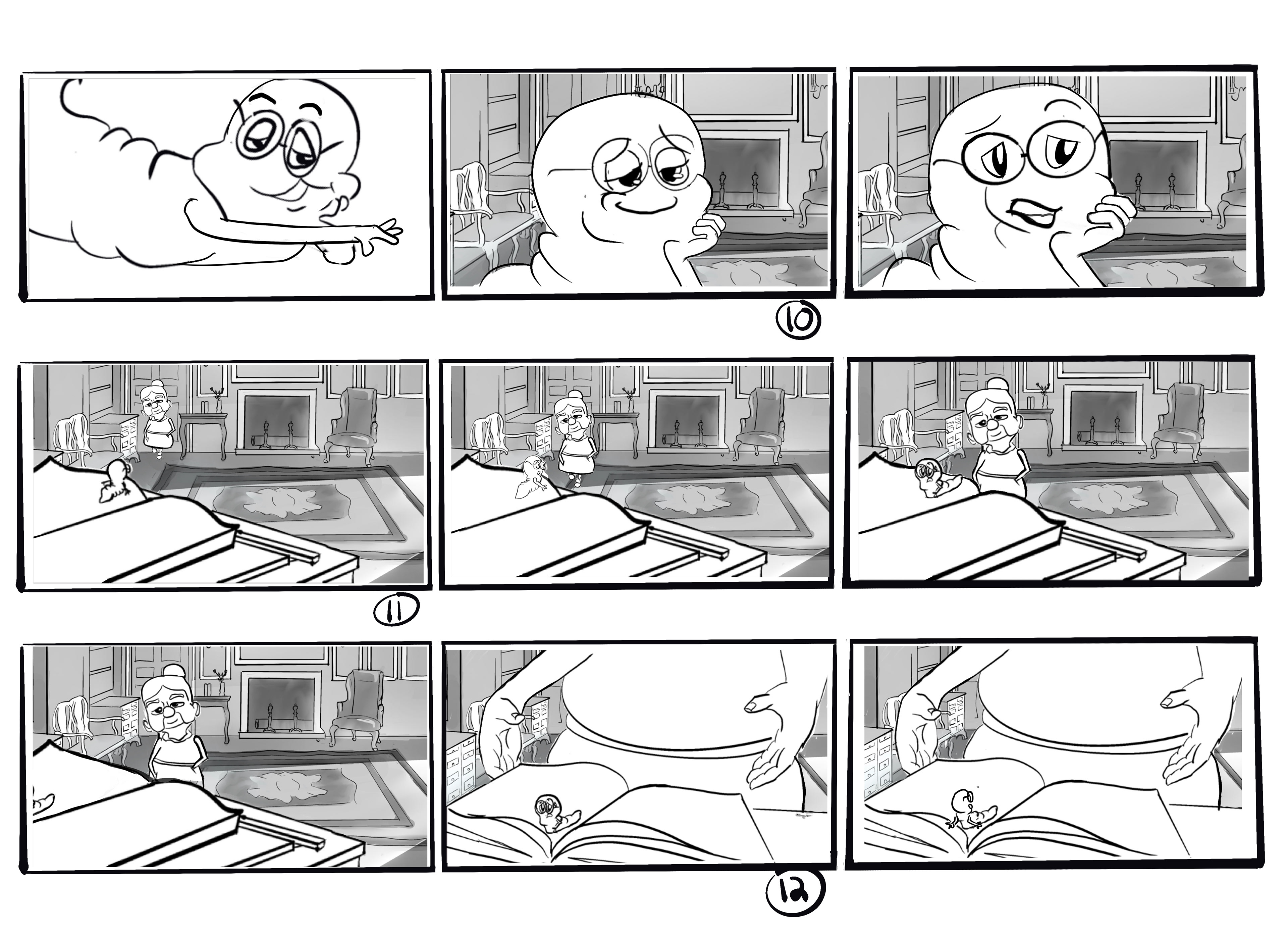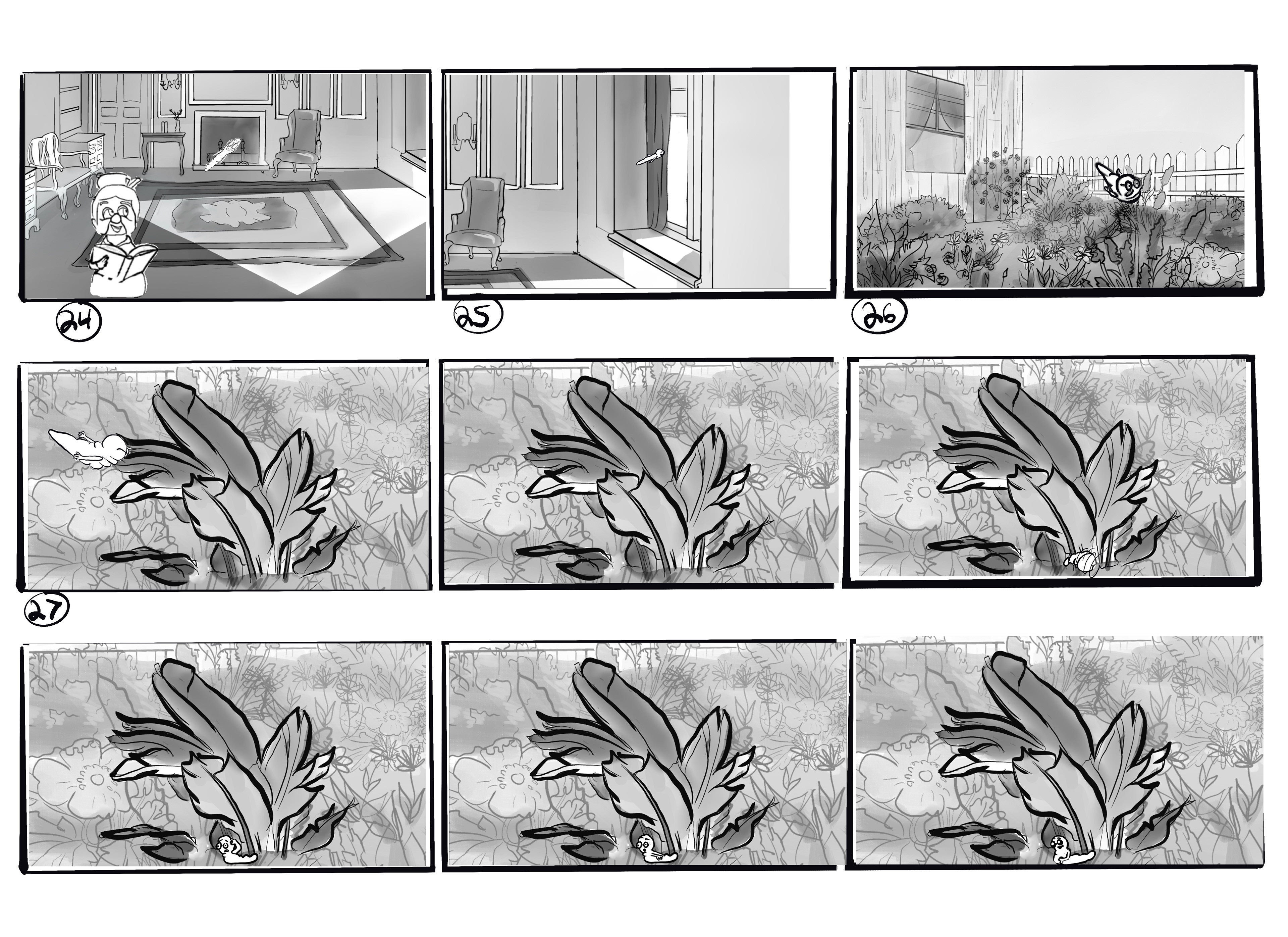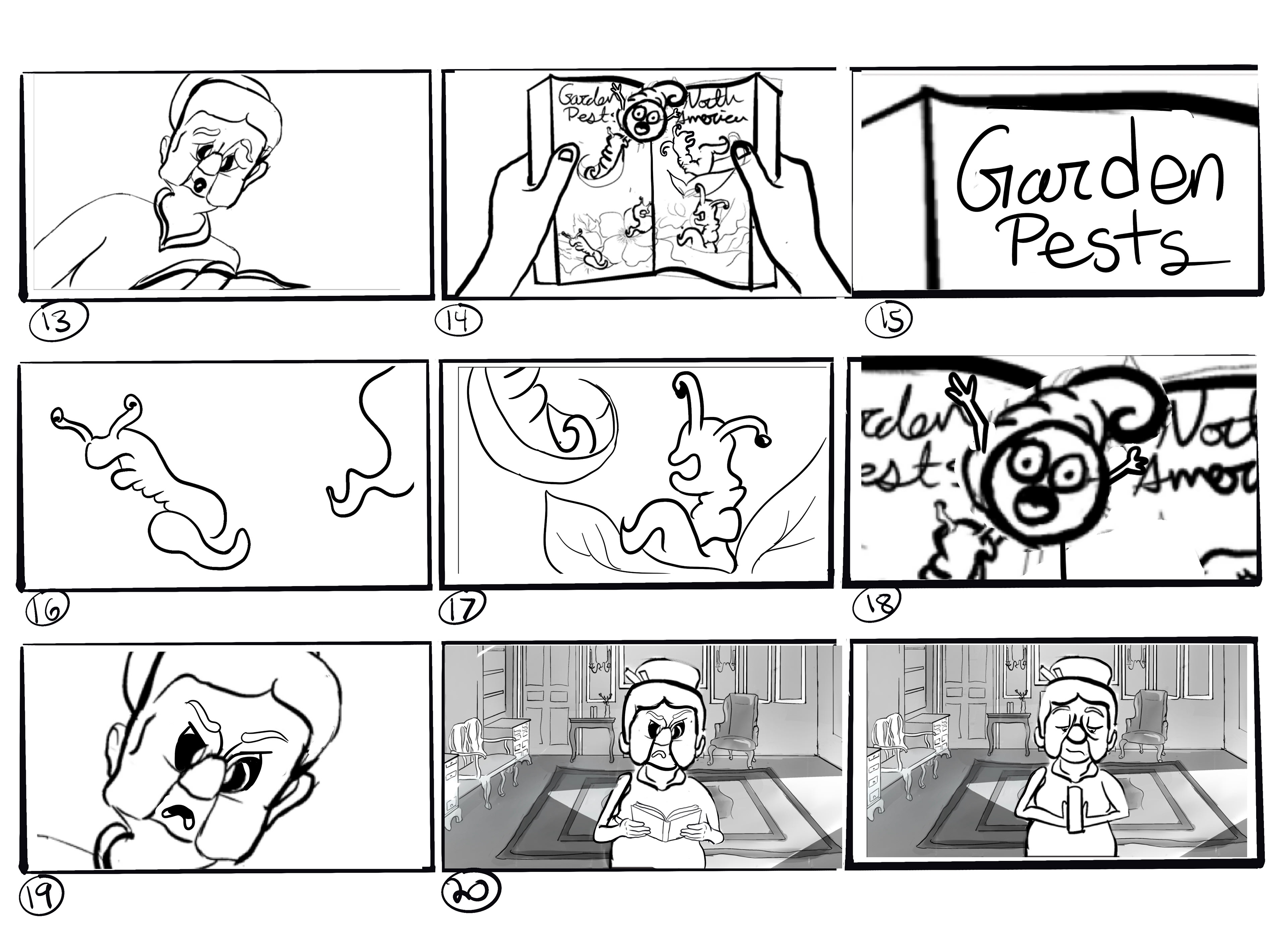 Garden Pests was originally going to be my short-film thesis. However, once layout began (bottom right) it became clear that the rigs were unusable. Given that I only had two remaining semesters at the Academy of Art, I was directed to scrap this project and pivot to a different thesis. When I began this project, I did not understand the scope of what I was undertaking and focused on story development rather than ensuring practical rigs. Attached below are the storyboards, set design, mood/inspiration board, animatic, and the beginning stages of layout.